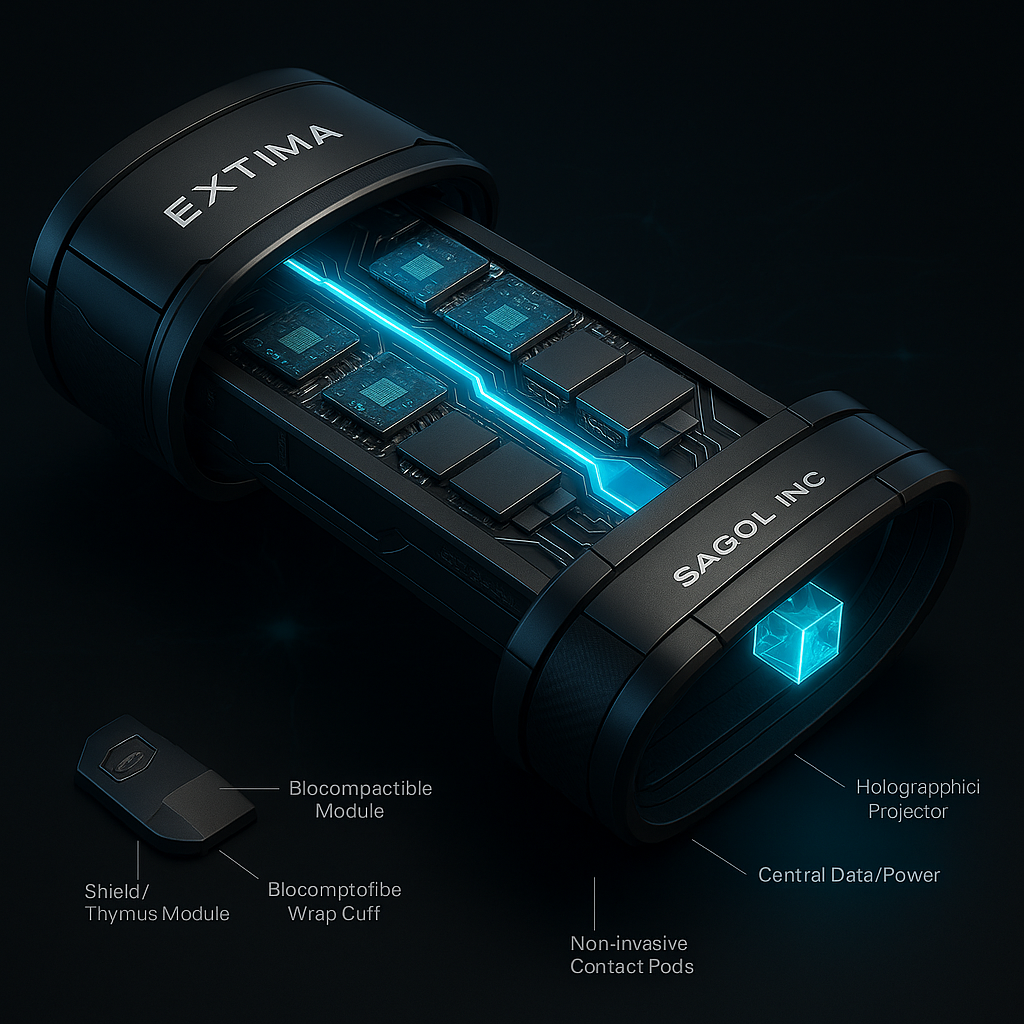 EXTIMA is defined as a next-generation neuromorphic wearable — combining adaptive biosensing, real-time modeling, and holographic interaction.